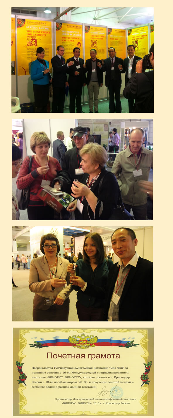(注释:贵州小飞酒业酒业公司,于2013年4月18日至20日参加了在俄罗斯克拉斯诺达尔市举办的第16次国际俄罗斯红酒及红酒技术专业展览会,获得伏特加系列金奖。——2013年国际俄罗斯红酒及红酒技术专业展览会组委会于俄罗斯克拉斯诺达尔市) |